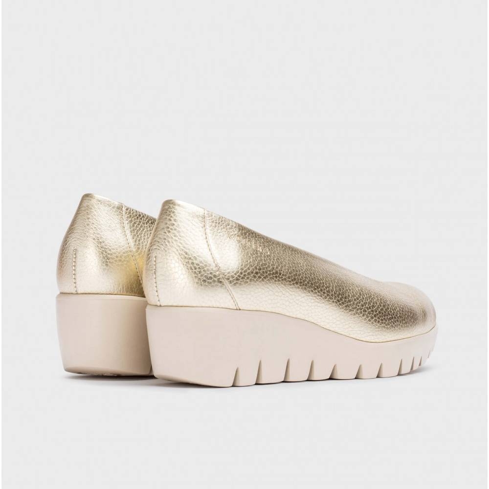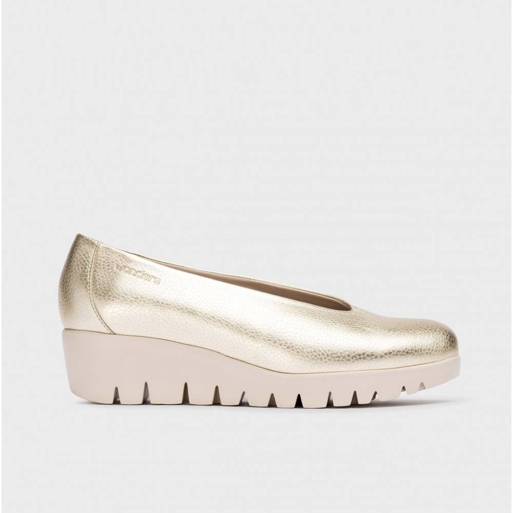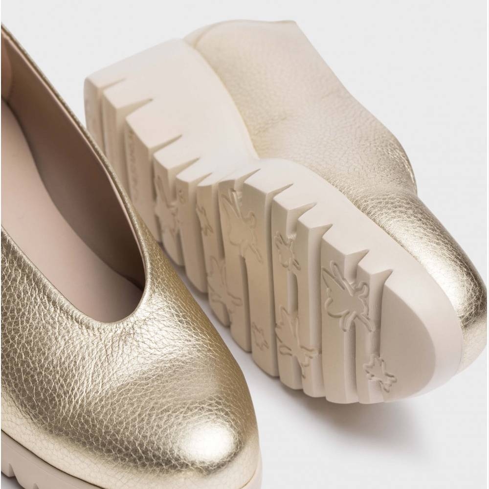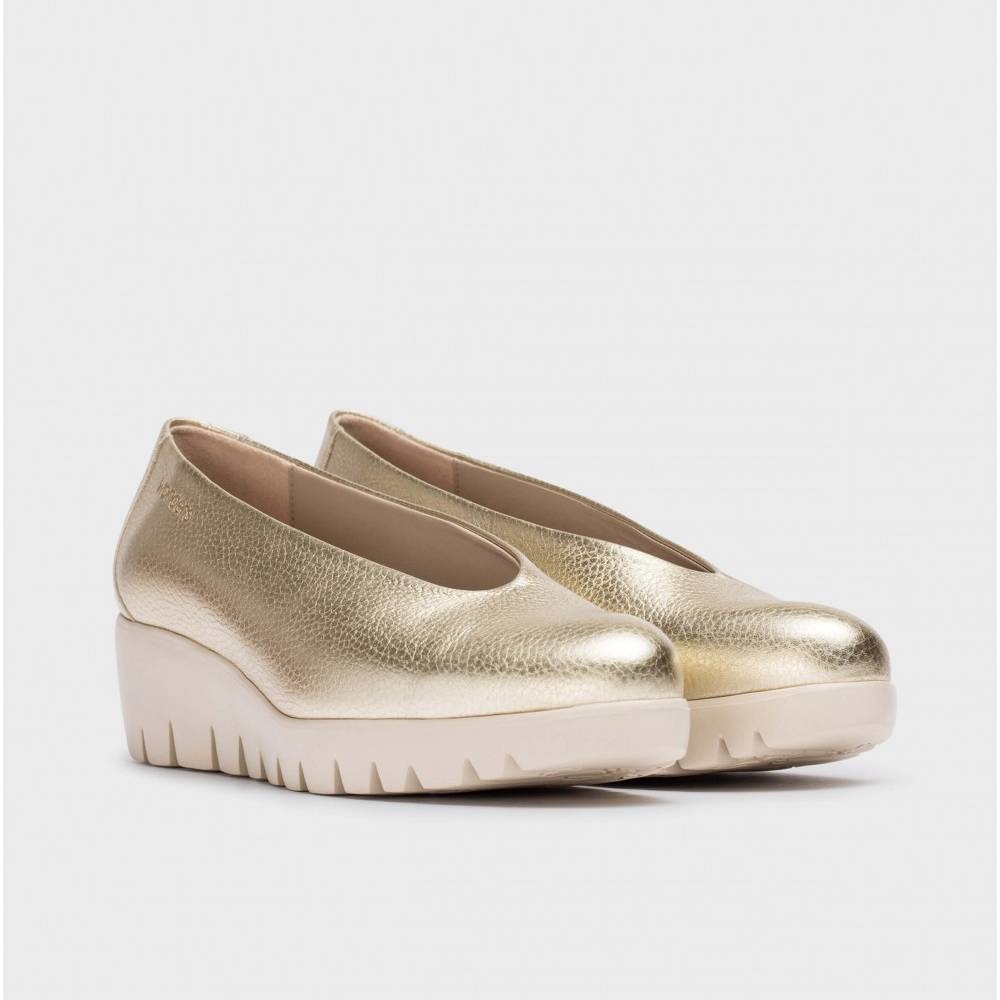 Zapato con cuña FLY confeccionado en piel metalizada en color oro. Un modelo clásico y atemporal de escote alto y punta redonda. Con plantilla memoryGel para una mejor pisada. Suela maxi dentada desarrollada con tecnología WondersFly ™ garantía de ligereza y confort . Prepárate para la sensación, YES WE FLY con nuestro Fly.