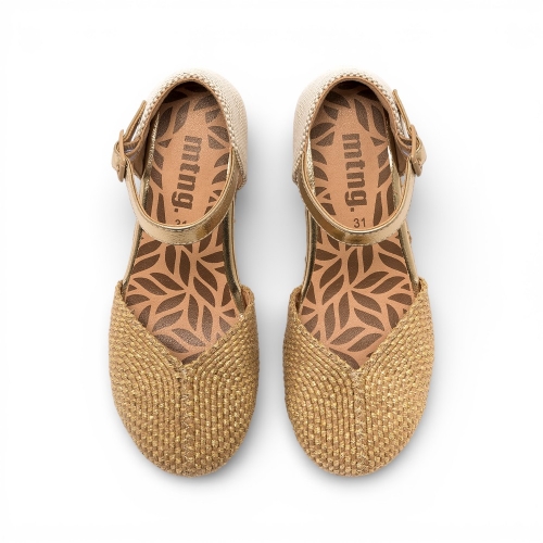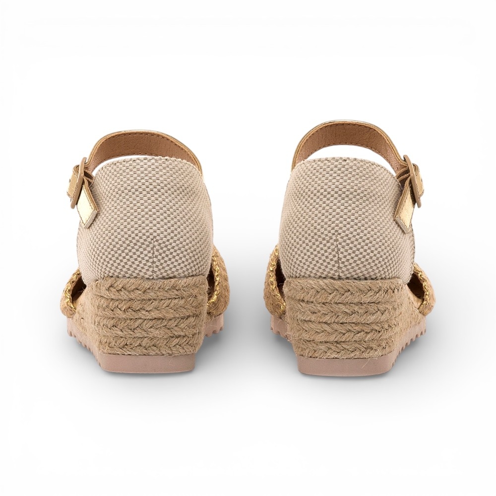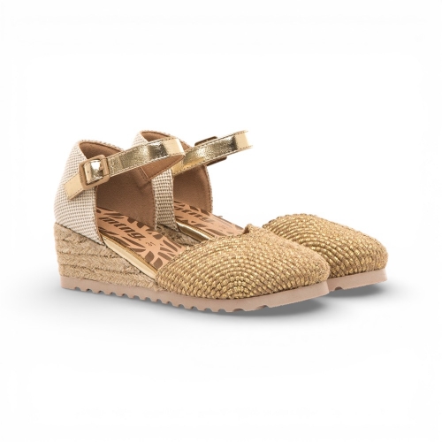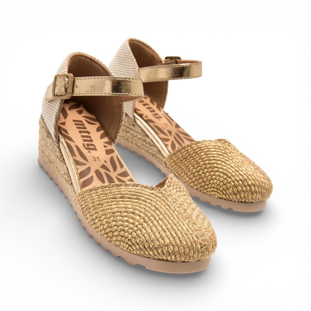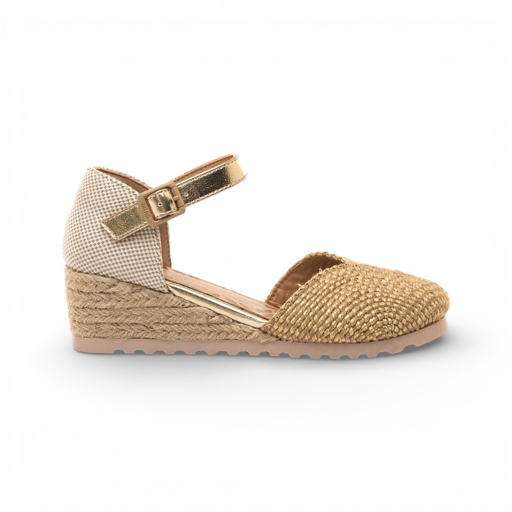 Esparteñas de color dorado con acabado natural para niña, modelo Padme de Mustang, ideales para aportar un toque veraniego a conjuntos especiales. Este diseño tipo cuña incorpora puntera cerrada con trenzado brillante y pulsera al tobillo con hebilla ajustable dorada que ayuda a una buena sujeción. La plataforma con efecto yute refuerza su aire fresco y ligero, mientras la combinación de tonos neutros facilita múltiples combinaciones. Una opción cómoda y actual para acompañar looks de temporada con personalidad.