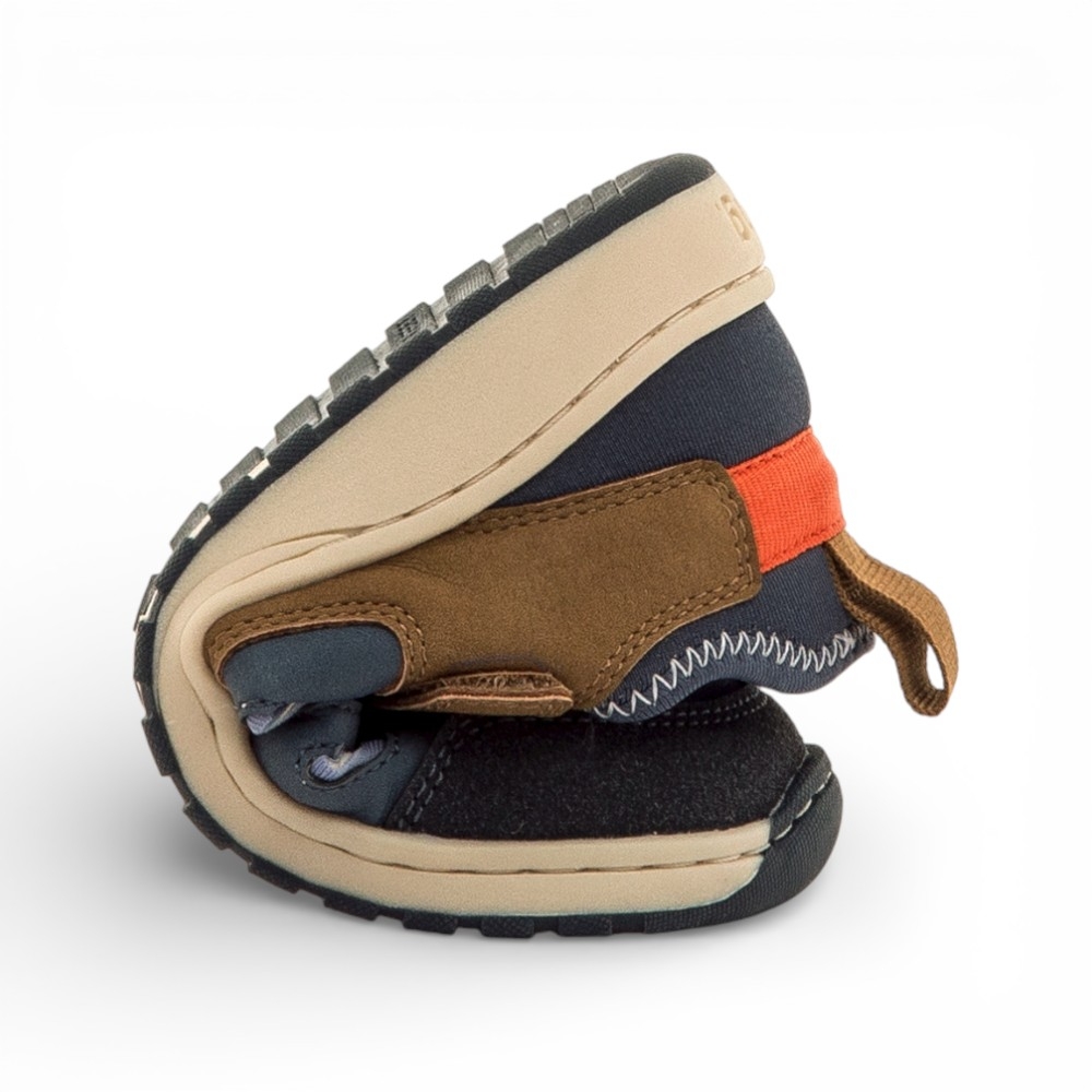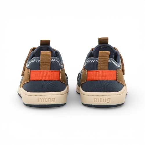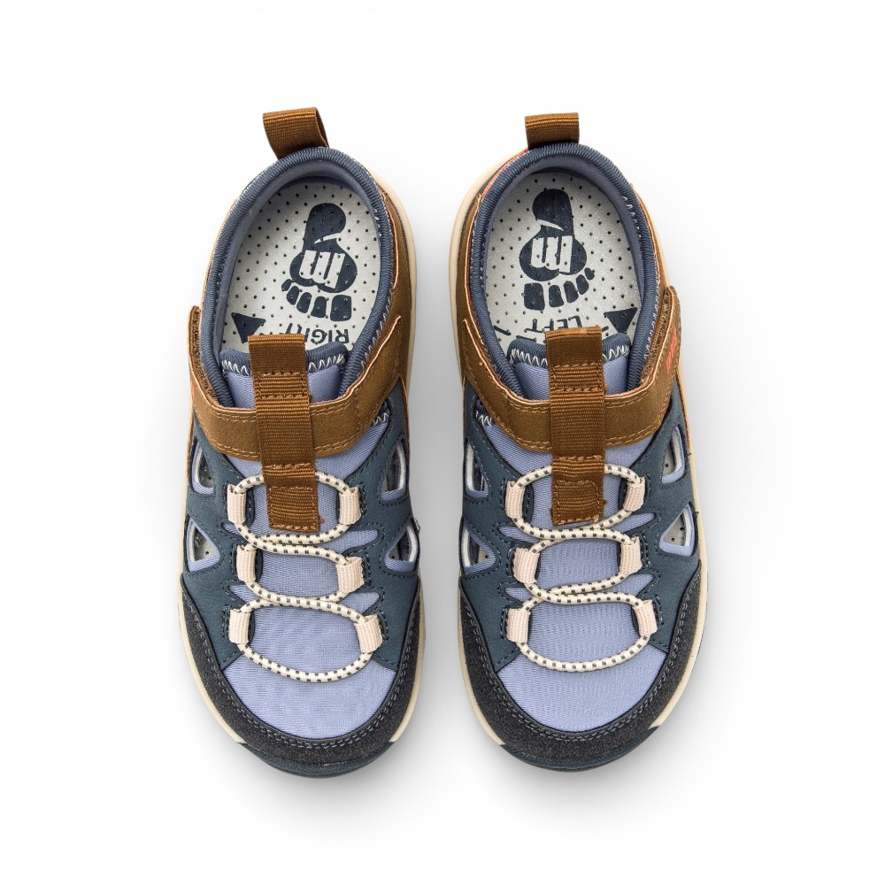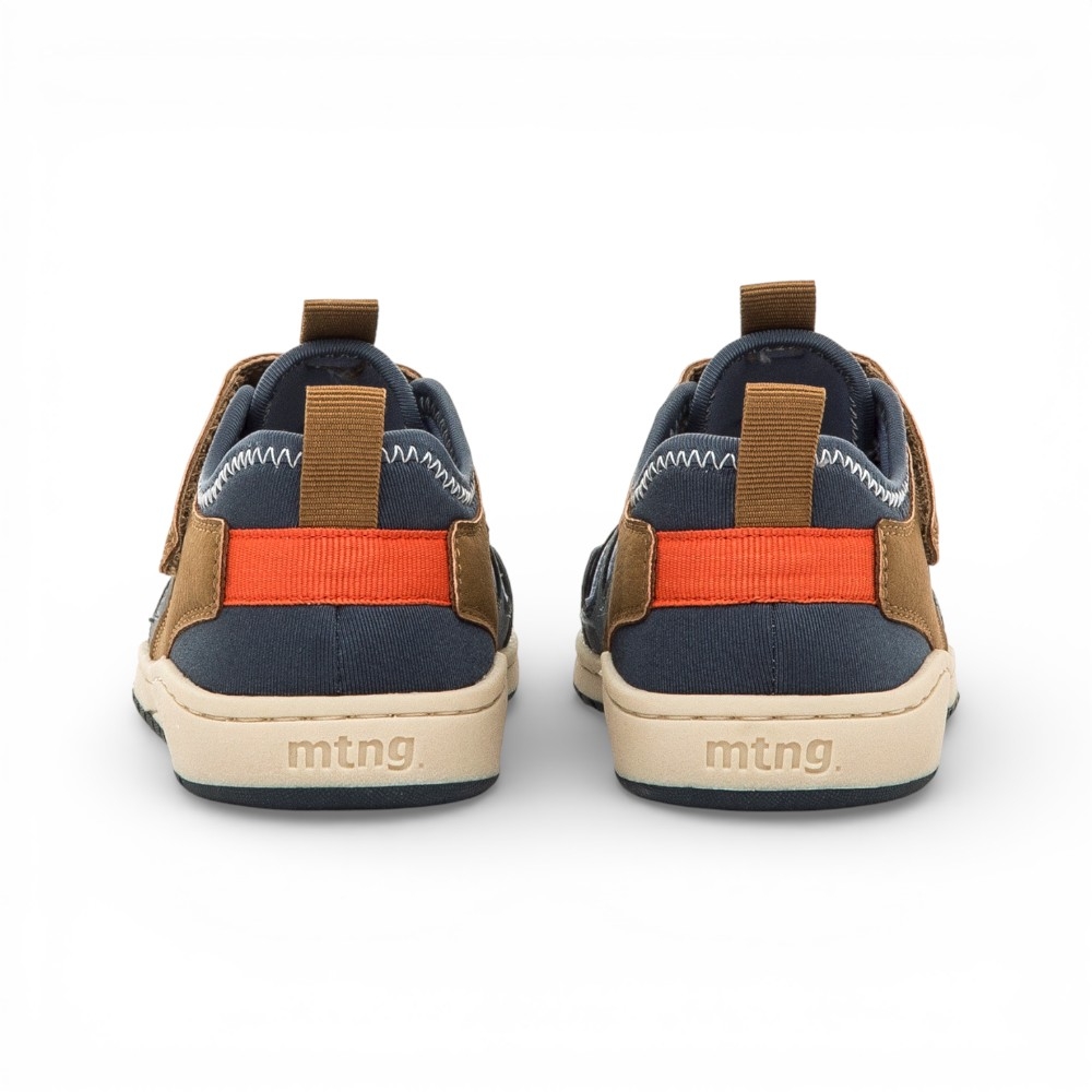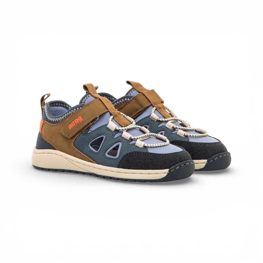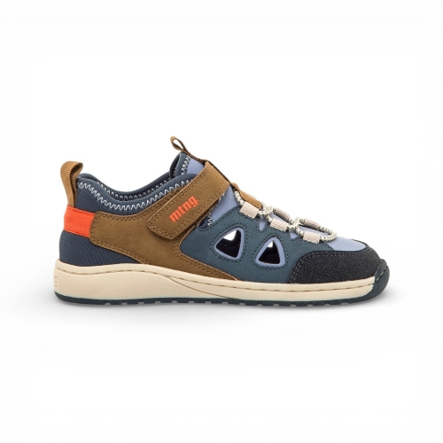 Sandalia tipo cangrejera para niño de la marca Mustang, modelo Free de color azul marino con detalles marrones y naranja. Diseñada con aberturas laterales para mayor ventilación, incorpora un cierre adhesivo y cordones elásticos que facilitan el ajuste. Diseñado y desarrollado especialmente en colaboración con el Dr. Juanjo López, traumatólogo deportivo e infantil, para respetar el desarrollo natural del pie del niño y la niña. Gracias a su puntera ancha permite el libre movimiento de los dedos dentro del zapato. Las plantillas extraíbles facilitan comprobar si la talla del calzado es la correcta para tu hijo. Además, su fácil apertura facilita que el niño pueda descalzarse y calzarse de forma autónoma. Con certificado VEGANO sellado por INESCOP, el cual garantiza que la naturaleza química principal del material no se corresponde con fibras de origen animal.