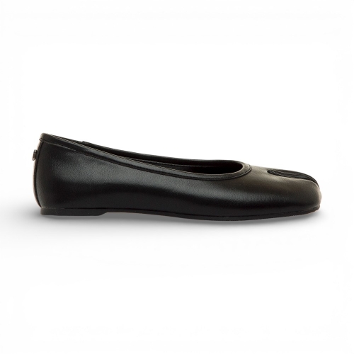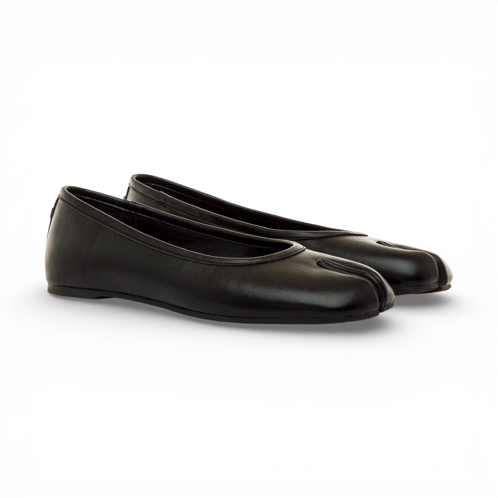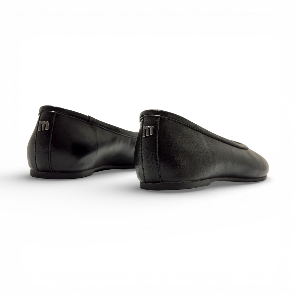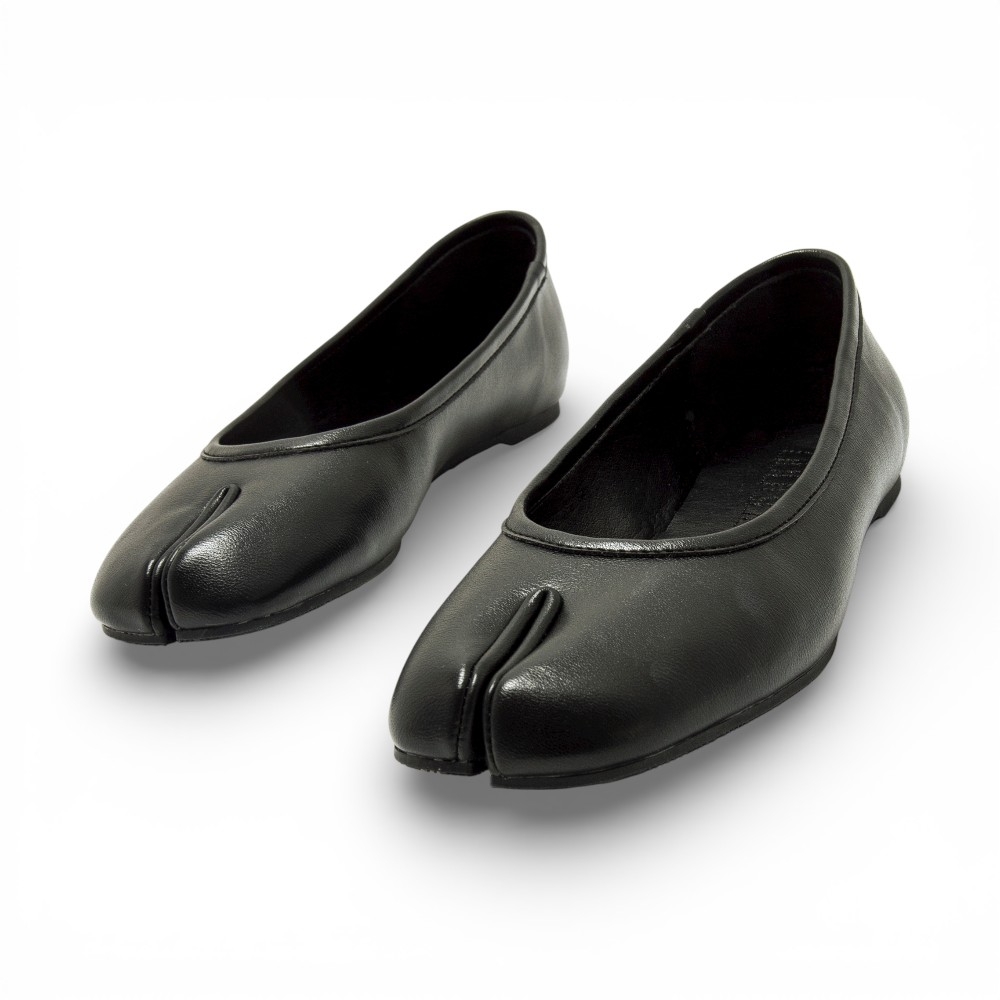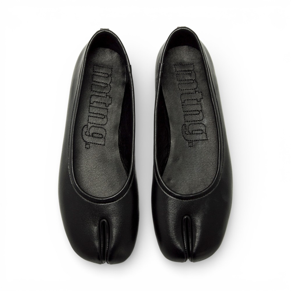 Bailarina plana con puntera tipo tabi de la marca Mustang, modelo Tabatha de color negro para mujer. Este diseño incorpora una ligera separación frontal de los dedos, junto a una suela fina que aporta comodidad. Su acabado liso se completa con el logo metálico trasero, encajando fácilmente en looks urbanos o más formales. Con certificado VEGANO sellado por INESCOP, el cual garantiza que la naturaleza química principal del material no se corresponde con fibras de origen animal.