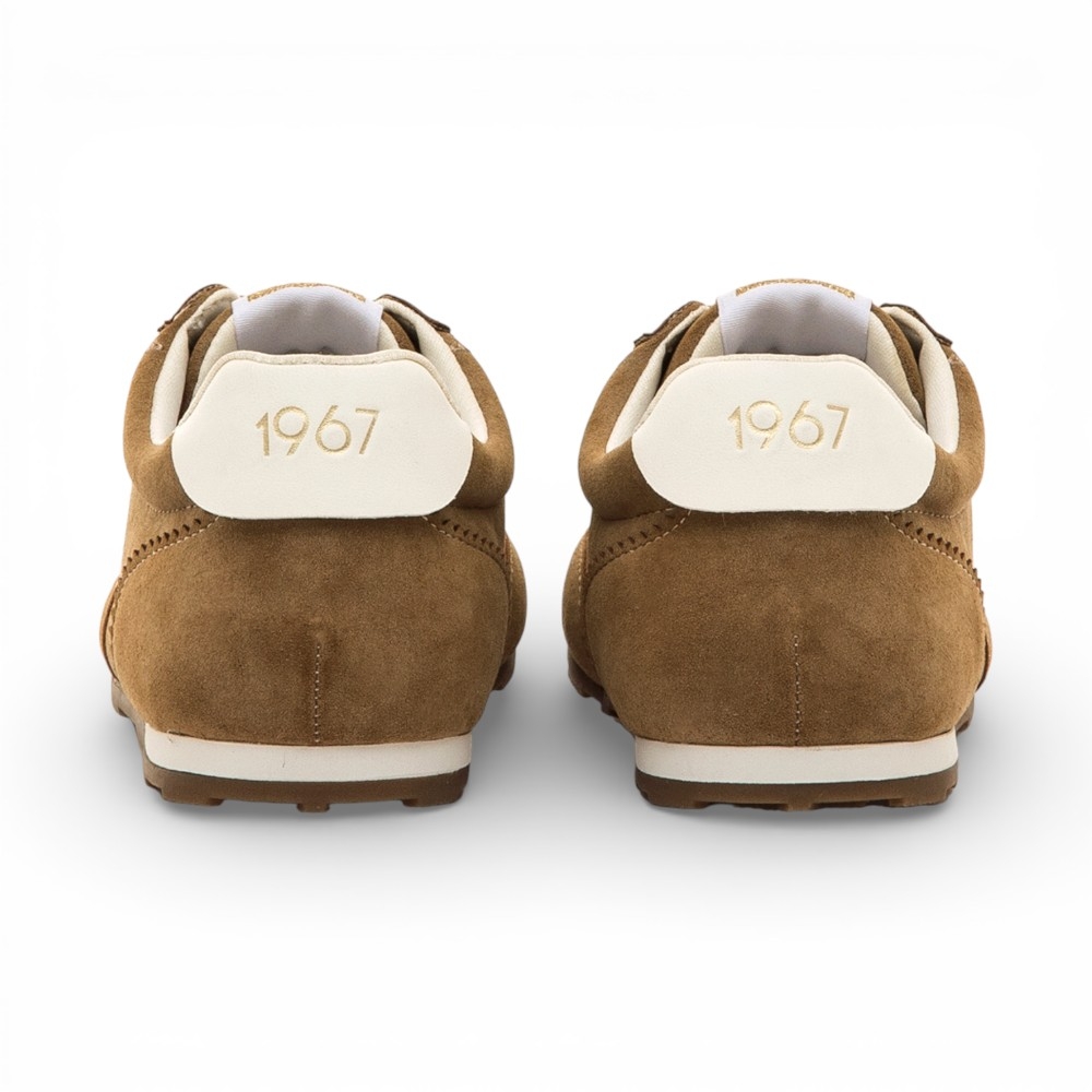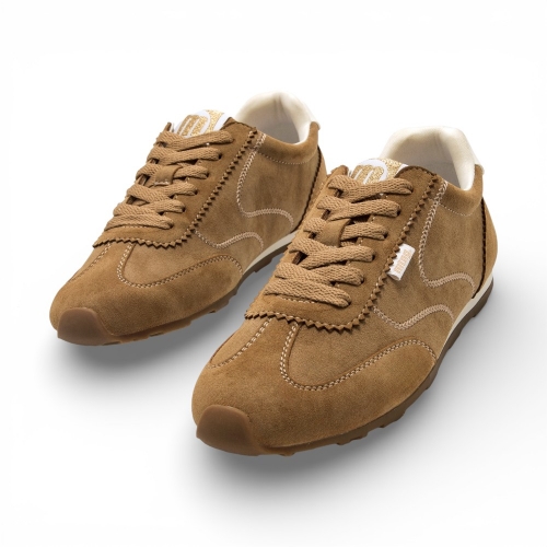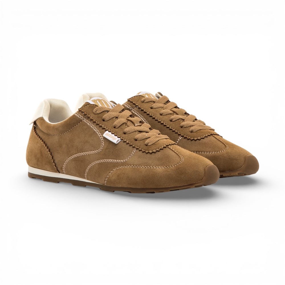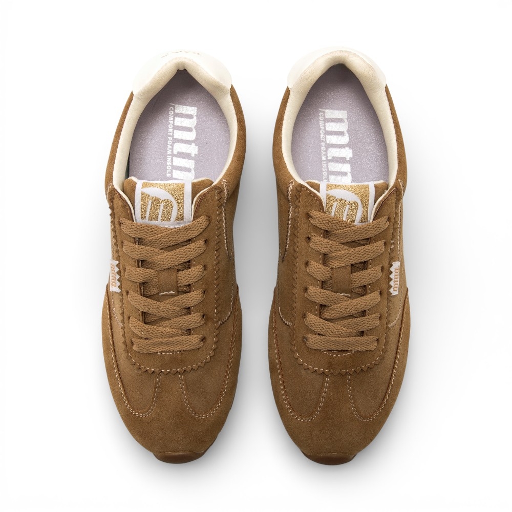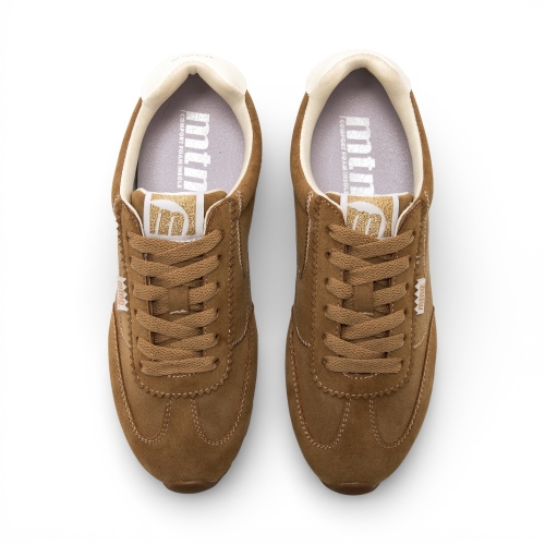 Zapatillas de color marrón cuero para mujer de la marca Mustang, modelo Janet, con diseño deportivo de inspiración vintage. Este modelo destaca por sus costuras marcadas y onduladas en contraste, junto a una suela dentada de goma. Destacan el talón en blanco y el logo Mustang en la lengüeta. Equipadas con plantillas con tecnología Starfit, que mejoran la comodidad en cada paso. Con certificado VEGANO sellado por INESCOP, el cual garantiza que la naturaleza química principal del material no se corresponde con fibras de origen animal.