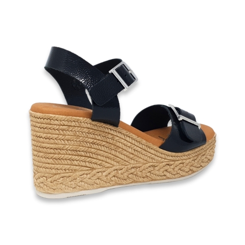 Sandalia de mujer fabricada en piel de color negro con suave grabado. Diseño con hebilla tanto en el talón como en la parte delantera para un mayor ajuste y comodidad. Detalle de trenza en la suela. Gracias a su planta acolchada y su cuña, el modelo Valle podrás llevarlo todo el día sin ningún problema.