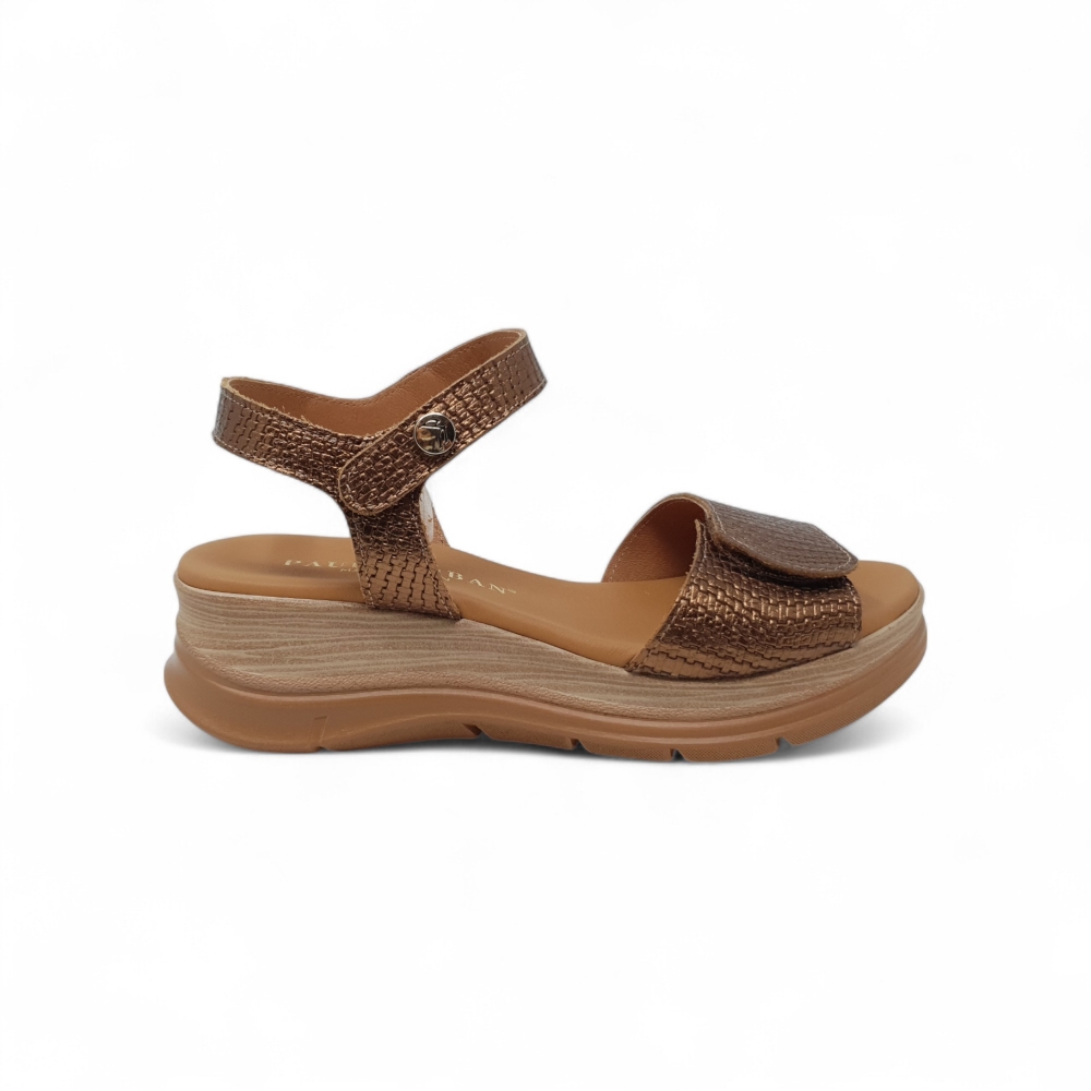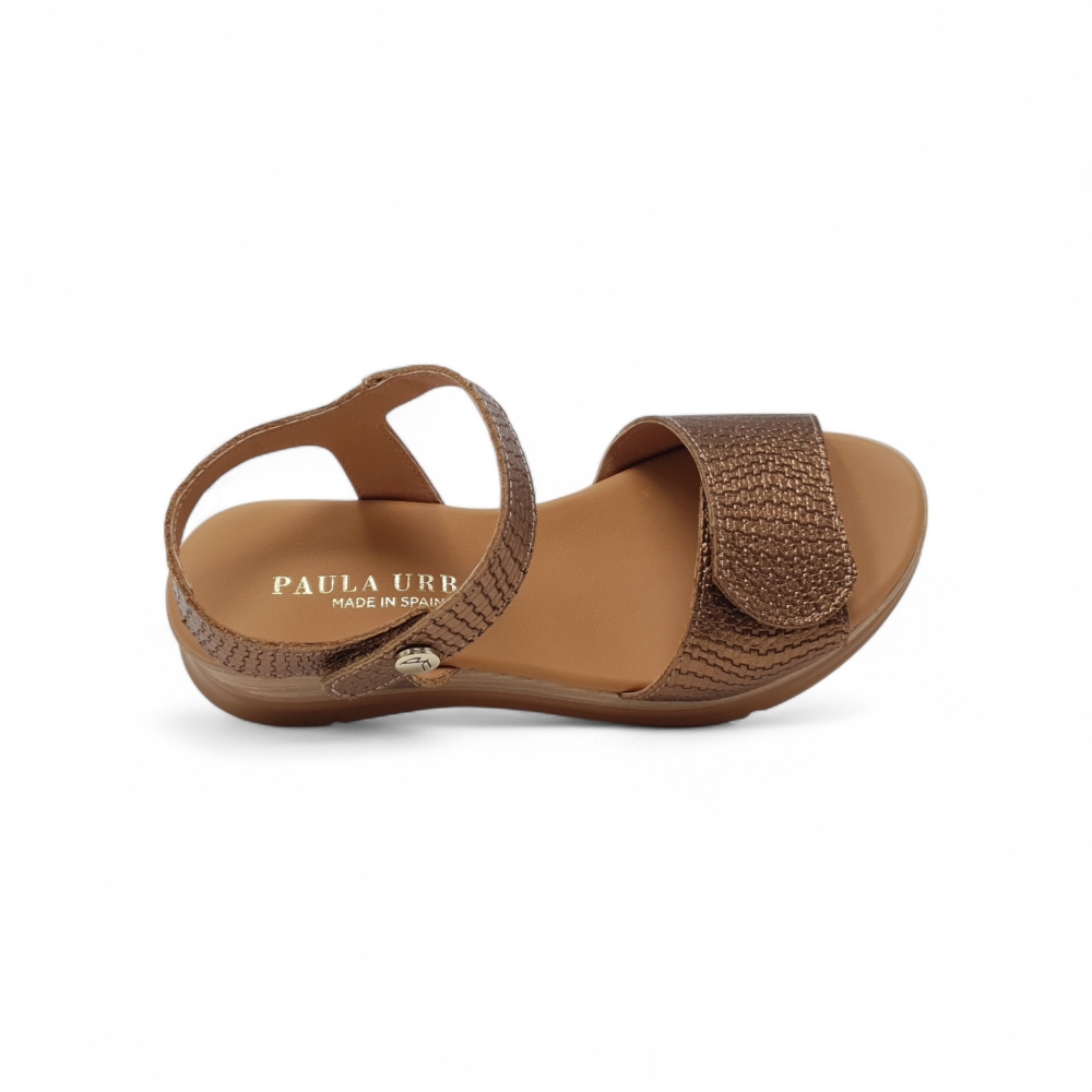 La SANDALIA 24-634 - BRONCE de PAULA URBAN es una opción ideal para quienes buscan estilo, confort y originalidad en un solo modelo. Su acabado en tono bronce aporta un brillo sutil que realza cualquier look, tanto de día como de noche. Gracias a su diseño envolvente y plantilla acolchada, esta sandalia garantiza una experiencia de uso cómoda y ligera durante toda la jornada. El tacón de 6 cm y la plataforma de 2 cm ofrecen la altura justa sin comprometer la estabilidad.